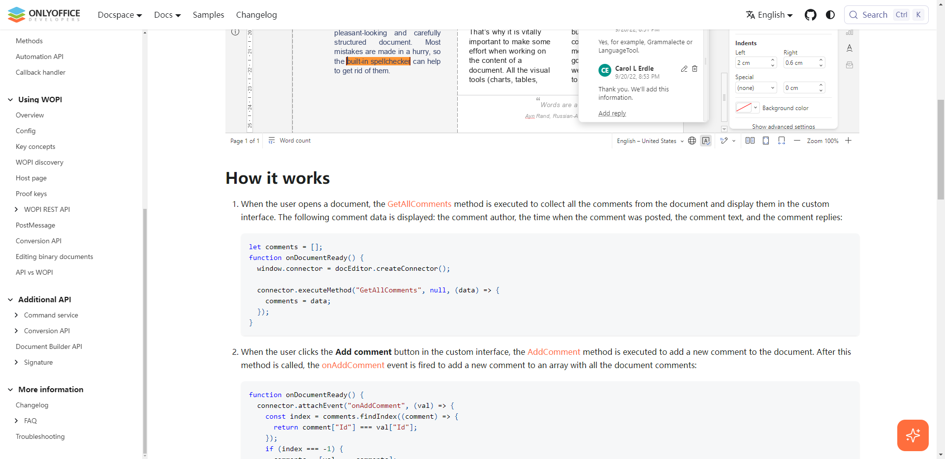 这个链接只有doc的示例,按照示例的代码,在电子表格中是无法正常使用的,没有办法将批注添加到选中的单元格上,也无法触发MoveToComment方法,请问给电子表格添加批注然后触发MoveToComment的效果,应该参考哪个文档?