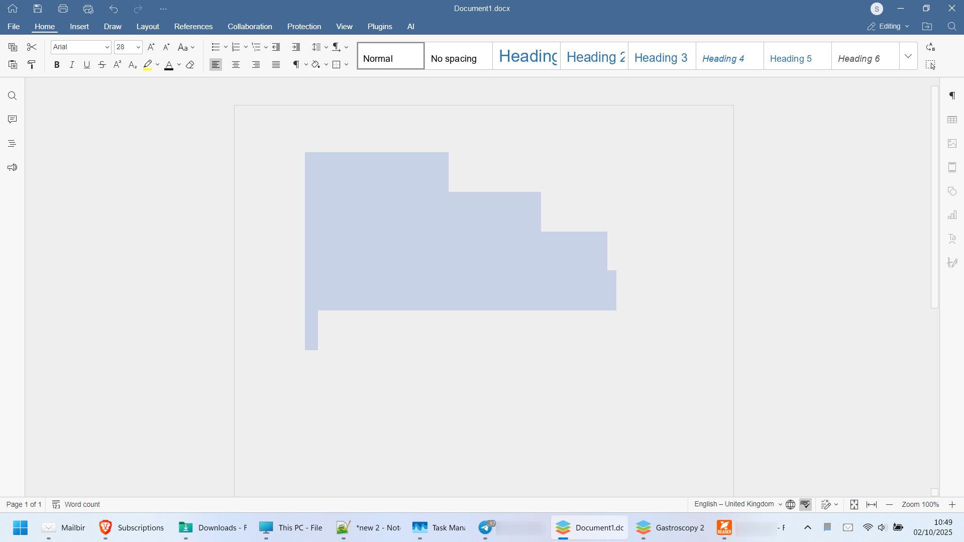 The text in my document and even the white background of the document has disappeared. I created a new document and typed some text then i later opened a .docx file which created a new window and when i went back to the other document 20mins or so later the text and background disappeared. Even when i select text the text doesn’t appear as shown in the screenshot. I can however copy the text with ctrl+c and paste it into notepad.