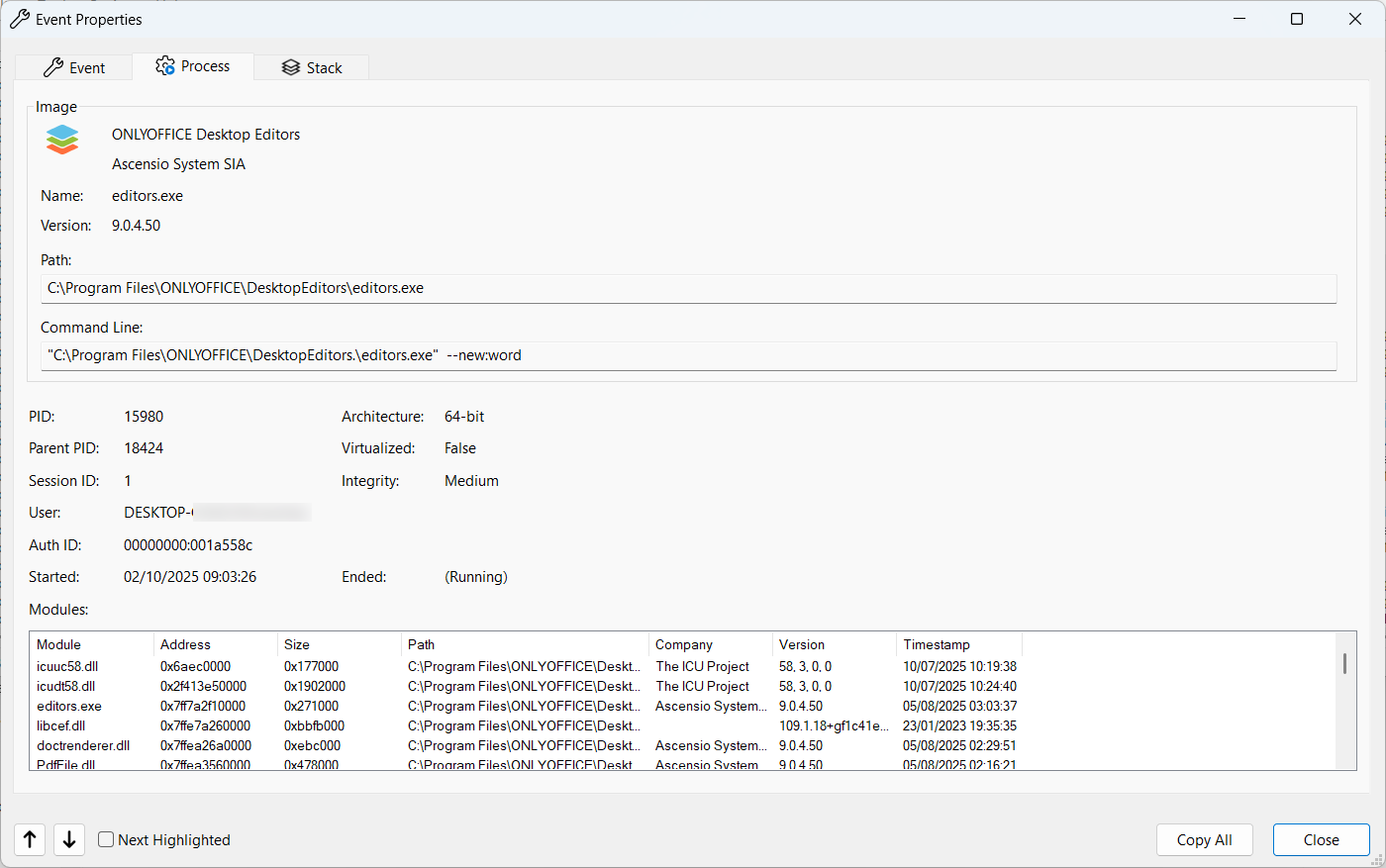 “C:\Program Files\ONLYOFFICE\DesktopEditors/editors_helper.exe” --type=renderer --log-severity=disable --user-agent-product=“Chrome/109.0.0.0 AscDesktopEditor/9.0.4.50” --user-data-dir=“C:\Users\REDCATED\AppData\Local\ONLYOFFICE\DesktopEditors\data\cache” --no-sandbox --force-color-profile=srgb --log-file=C:/Users/REDACTED/AppData/Local/ONLYOFFICE/DesktopEditors/data/cache/log.log --lang=en-US --device-scale-factor=1.25 --num-raster-threads=2 --enable-main-frame-before-activation --renderer-client-id=7 --time-ticks-at-unix-epoch=-1759188042379950 --launch-time-ticks=206940789643 --mojo-platform-channel-handle=3736 --field-trial-handle=1740,i,904902602336896407,13091958404624164199,131072 --disable-features=BackForwardCache,CalculateNativeWinOcclusion,WinUseBrowserSpellChecker /prefetch:1
