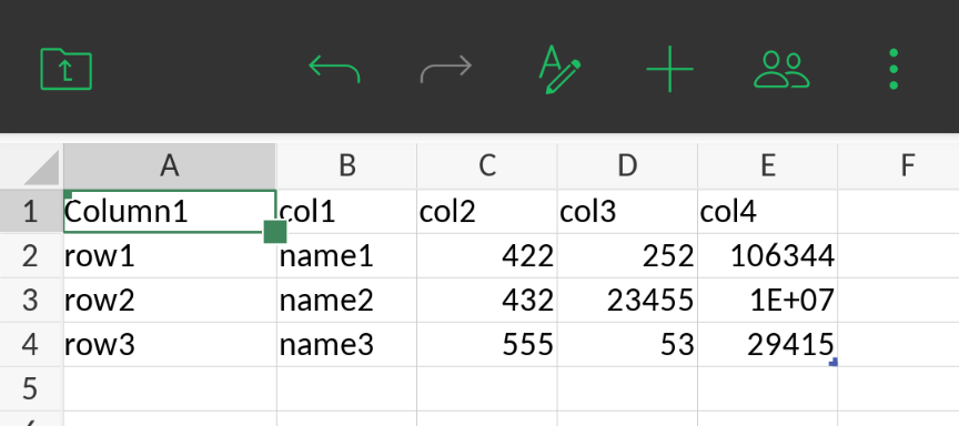 With the file now opened in mobile, tap “+”, tap “…”, tap “Sort and filter”, and then tap the “Filter” toggle to on. This will add the filter to the top row (even though you can’t see any filter buttons). But in addition, it will add the text “Column1” to A1, as shown here: