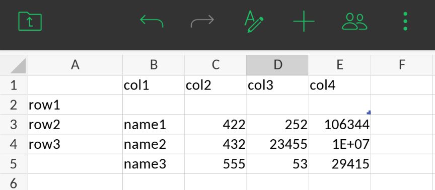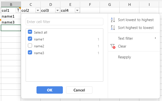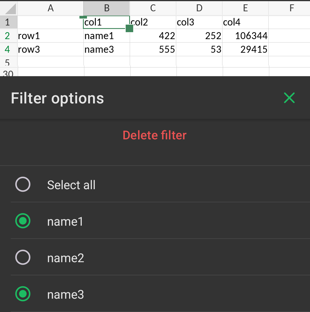 Furthermore, if you select the cell with a filter applied (e.g. my B1 above that has filtered out “name2”), and tap the “+” button, tap “…”, then tap “Sort and filter”, the “Filter options” are also not shown, but you just get the overall Sort & Filter menu: