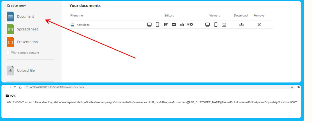 It looks like you ran integrated example of a storage. Please clarify what guide you used. We have information about integration steps with Document server in our official guides. For example: https://api.onlyoffice.com/editors/example/nodejs