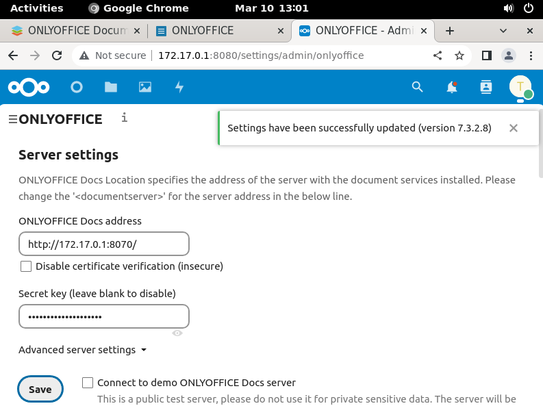[2023-02-28T09:32:30.265] [WARN] [localhost] [docId] [userId] nodeJS - Set services.CoAuthoring.token.enable.browser, services.CoAuthoring.token.enable.request.inbox, services.CoAuthoring.token.enable.request.outbox in the Document Server config to prevent an unauthorized access to your documents and the substitution of important parameters in ONLYOFFICE Document Server requests.