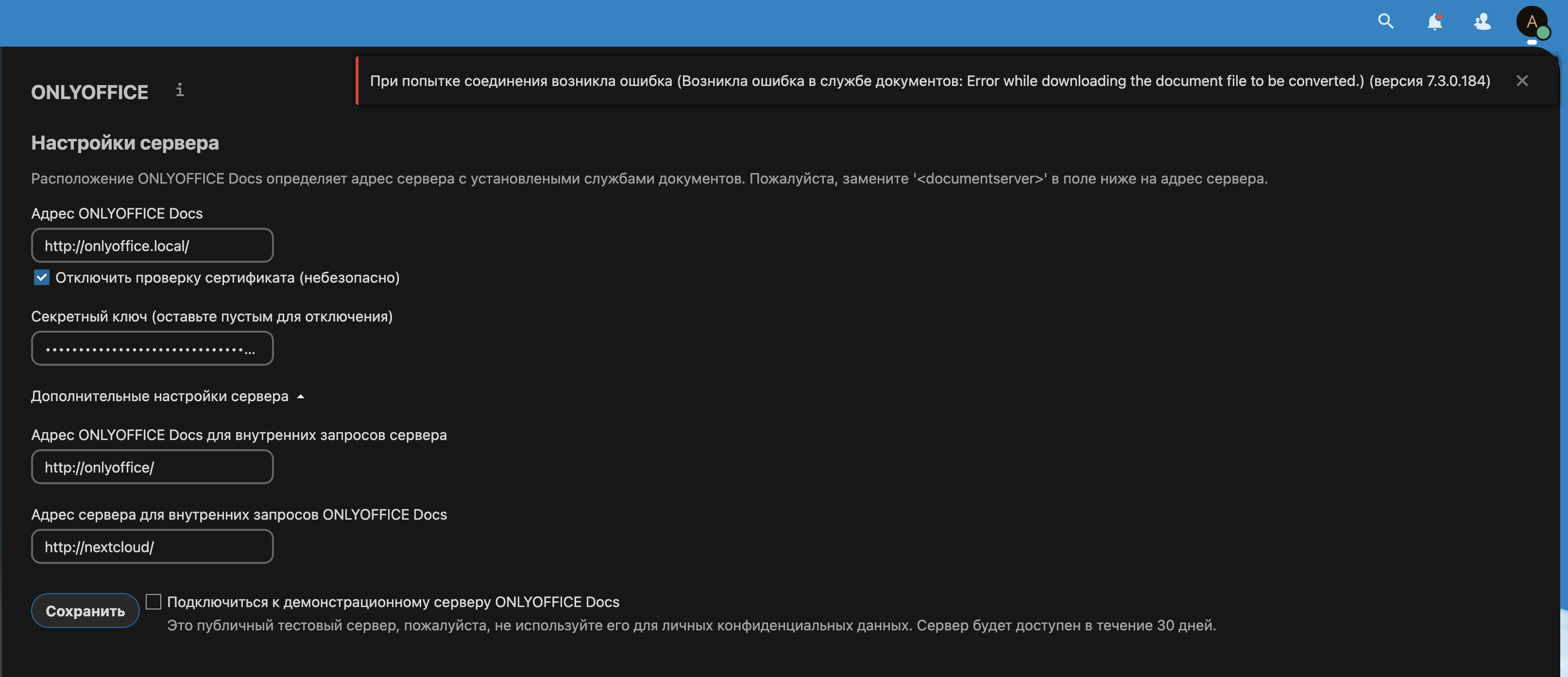 [2023-02-28T09:42:10.484] [ERROR] [localhost] [conv_check_878523943_docx] [userId] nodeJS - error downloadFile:url=http://nextcloud.local/apps/onlyoffice/empty?doc=eyJ0eXAiOiJKV1QiLCJhbGciOiJIUzI1NiJ9.eyJhY3Rpb24iOiJlbXB0eSJ9.p-8J2ZjLloCQaTfw5SVgL6Twi7mkWydBKB5Cd09jsLY;attempt=2;code:undefined;connect:undefined Error: Error response: statusCode:404; headers:{"server":"nginx","date":"Tue, 28 Feb 2023 09:42:10 GMT","content-type":"text/html; charset=utf-8","transfer-encoding":"chunked","connection":"keep-alive","vary":"Accept-Encoding","content-security-policy":"default-src 'none'","x-content-type-options":"nosniff","content-encoding":"gzip"};