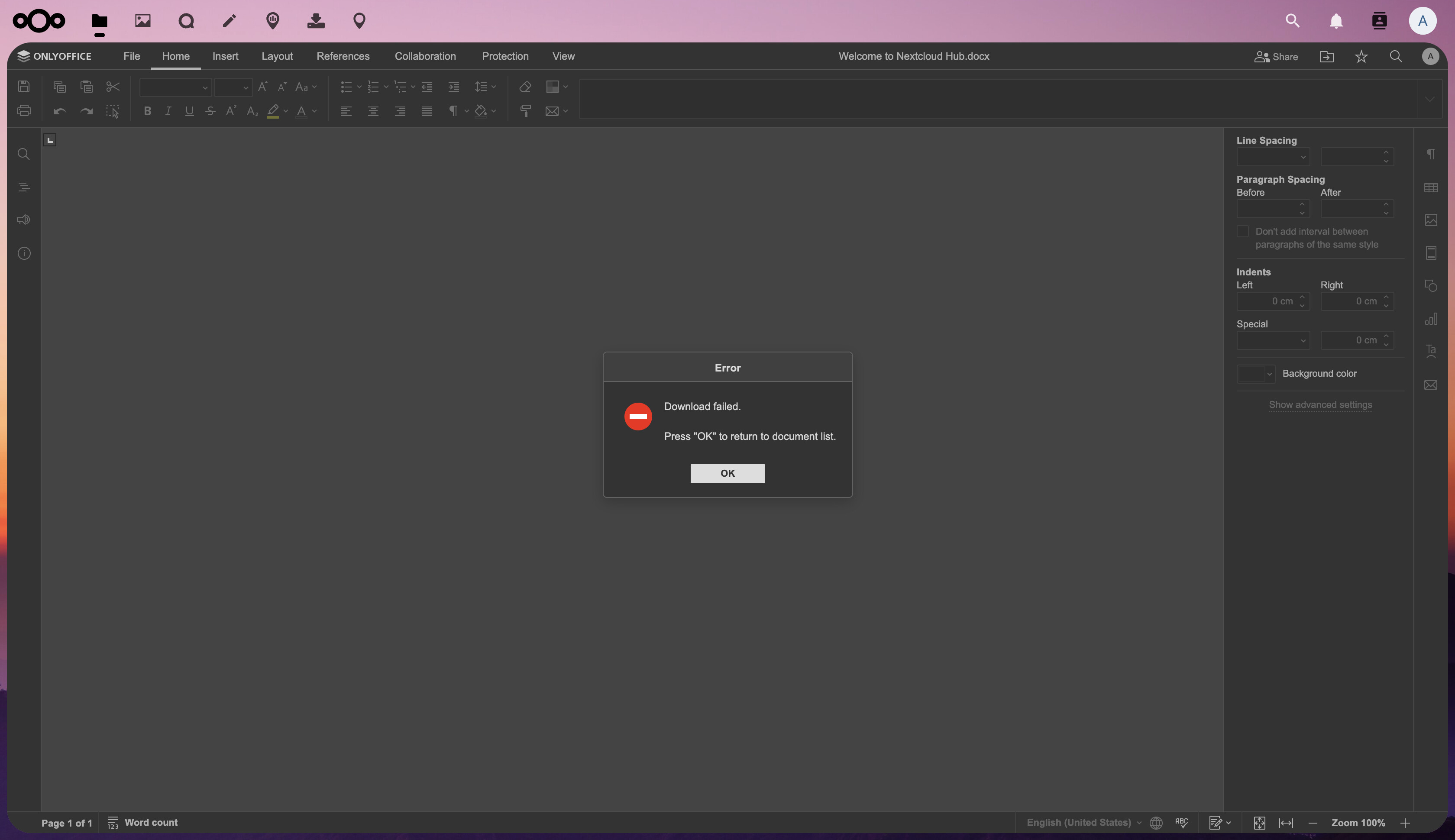 [2023-02-28T09:45:48.798] [ERROR] [localhost] [conv_check_430651493_docx] [userId] nodeJS - error downloadFile:url=http://nextcloud.local/apps/onlyoffice/empty?doc=eyJ0eXAiOiJKV1QiLCJhbGciOiJIUzI1NiJ9.eyJhY3Rpb24iOiJlbXB0eSJ9.p-8J2ZjLloCQaTfw5SVgL6Twi7mkWydBKB5Cd09jsLY;attempt=3;code:undefined;connect:undefined Error: Error response: statusCode:404; headers:{"server":"nginx","date":"Tue, 28 Feb 2023 09:45:48 GMT","content-type":"text/html; charset=utf-8","transfer-encoding":"chunked","connection":"keep-alive","vary":"Accept-Encoding","content-security-policy":"default-src 'none'","x-content-type-options":"nosniff","content-encoding":"gzip"};