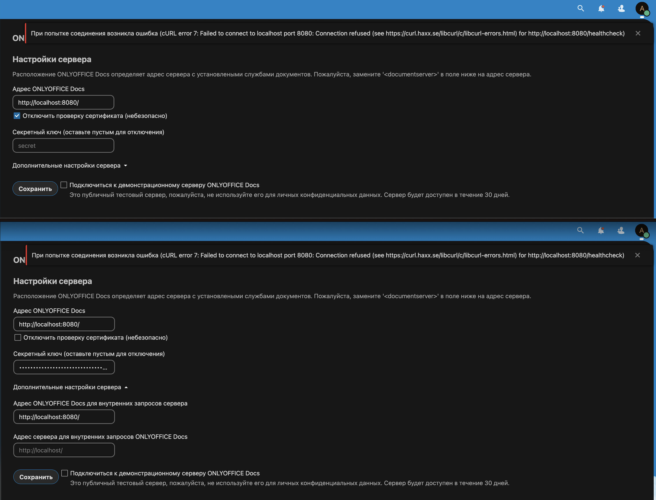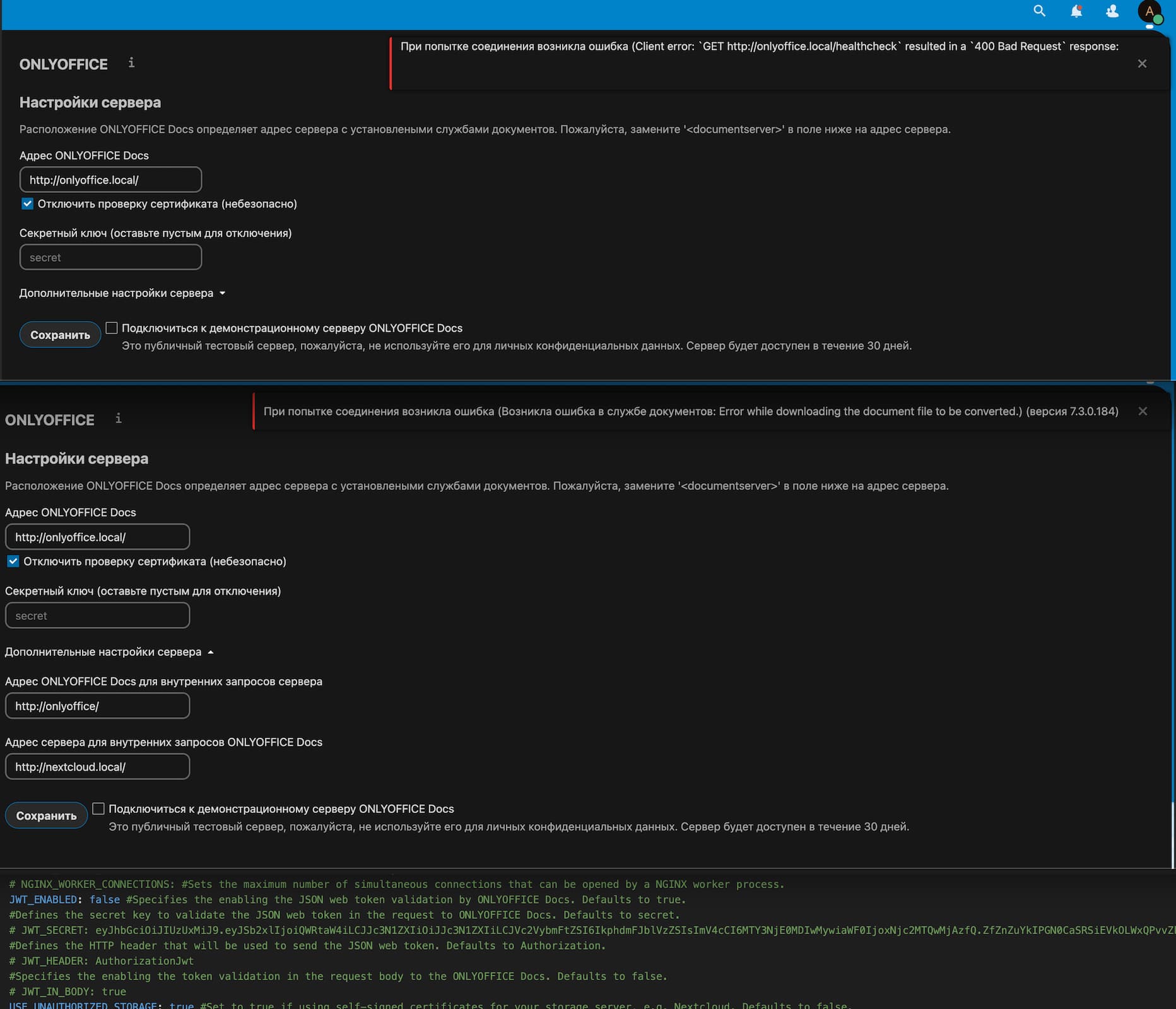 [2023-02-28T09:45:46.785] [ERROR] [localhost] [conv_check_430651493_docx] [userId] nodeJS - error downloadFile:url=http://nextcloud.local/apps/onlyoffice/empty?doc=eyJ0eXAiOiJKV1QiLCJhbGciOiJIUzI1NiJ9.eyJhY3Rpb24iOiJlbXB0eSJ9.p-8J2ZjLloCQaTfw5SVgL6Twi7mkWydBKB5Cd09jsLY;attempt=1;code:undefined;connect:undefined Error: Error response: statusCode:404; headers:{"server":"nginx","date":"Tue, 28 Feb 2023 09:45:46 GMT","content-type":"text/html; charset=utf-8","transfer-encoding":"chunked","connection":"keep-alive","vary":"Accept-Encoding","content-security-policy":"default-src 'none'","x-content-type-options":"nosniff","content-encoding":"gzip"};