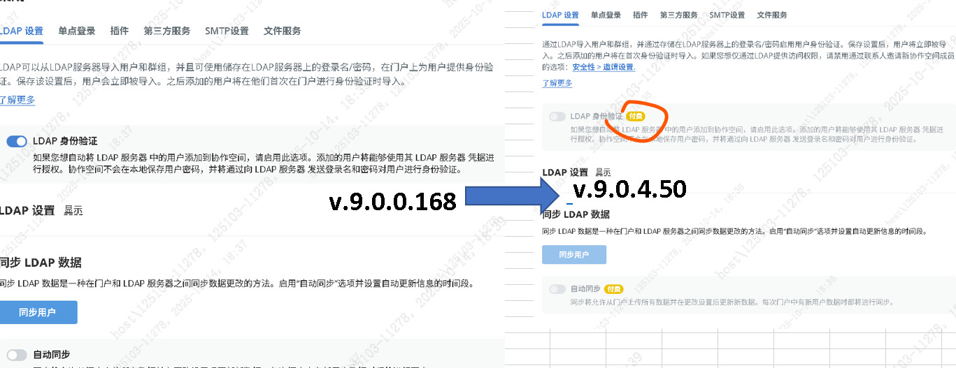 After upgrading from v.9.0.0.168 to v.9.0.4.50 in the community version, LDAP requires payment