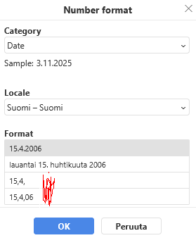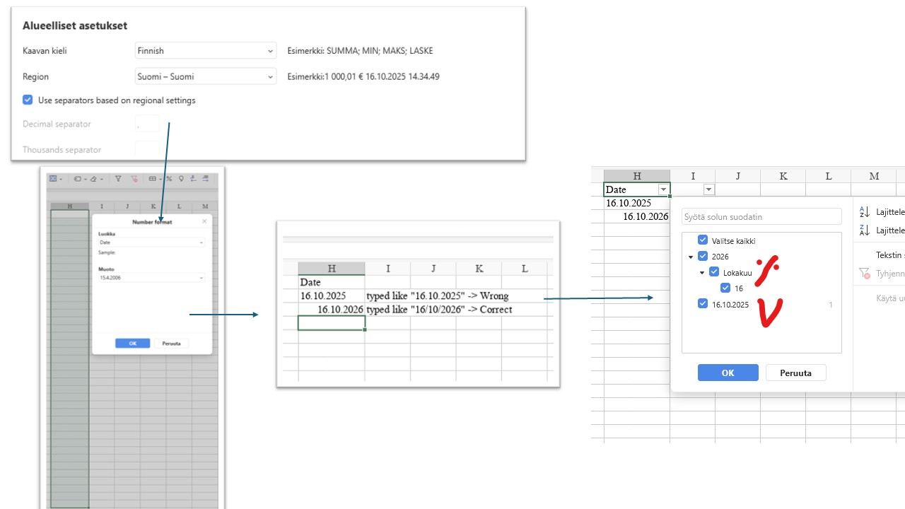 Report a bug/how to reproduce: I have finnish / suomi settings in my spreadsheets → If I type finnish date “16.10.2025” + Enter in a column which has correct date formatting, the date is still wronly formatted. Only way to enter correct date is still type it like “16/10/2025” + Enter
