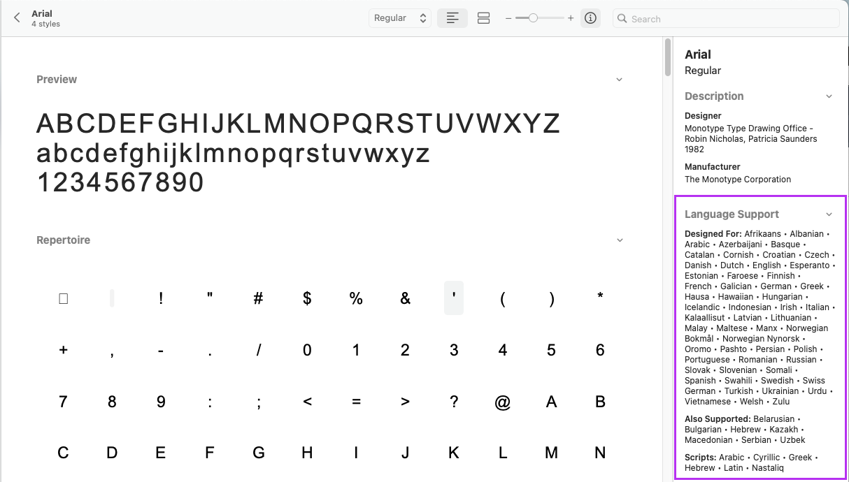 In a TTF or OTF file (font file), there is a list of supported language by the font, for example and always in Apple Font Book for Arial :