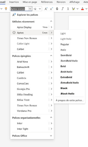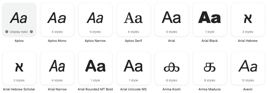 Aptos shows all fonts of that family as a group as indicated in the Windows Font manager, but