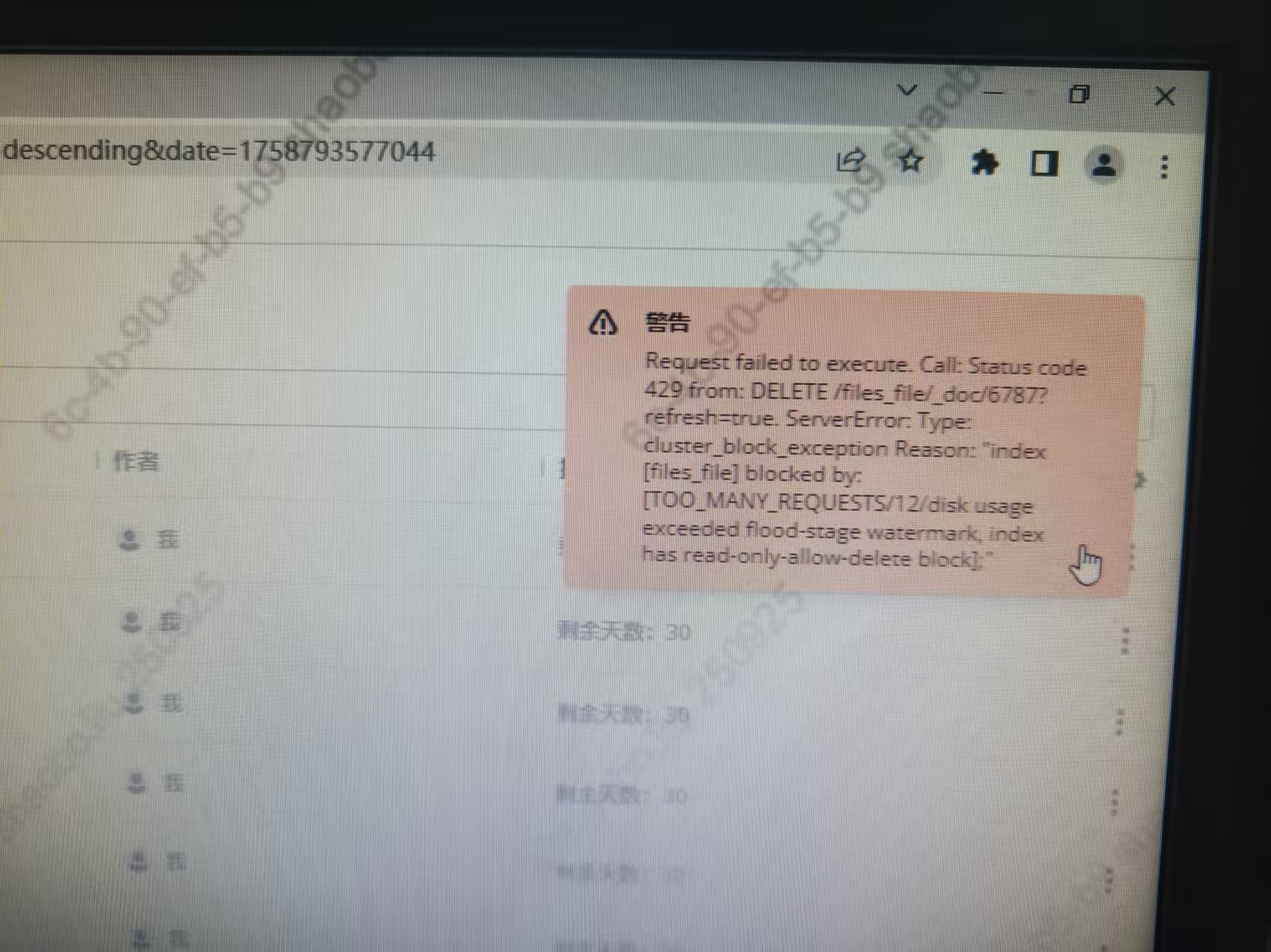 报错内容:too_many_requests/12/disk usage exceeded flood-stage watermark index has read-only-