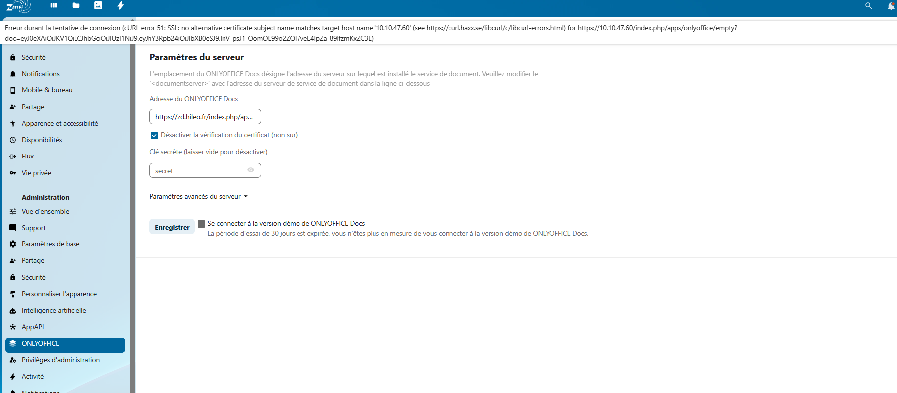 I just received an email saying âONLYOFFICE Document Server is unavailableâ and when I access the administration interface, my OnlyOffice configuration no longer exists. I have to click âSaveâ for it to work again (see video).