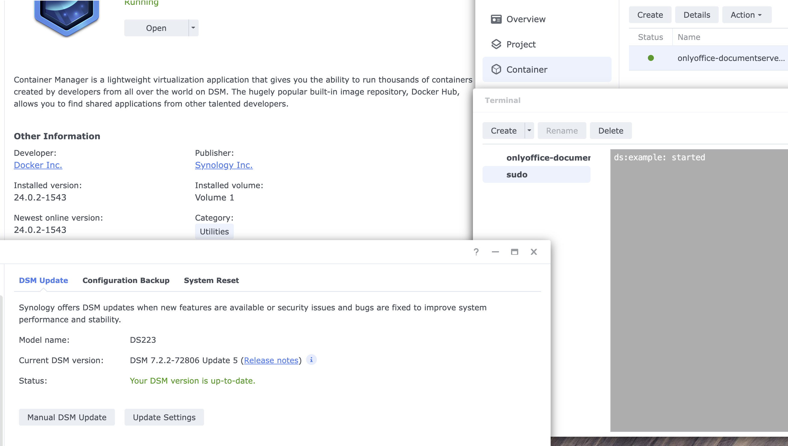 I used the OO video to install OO on my Synology NAS 1522+ running DSM 7.2.2-72806 Update 5, with Container Manager 24.0.2-1543.