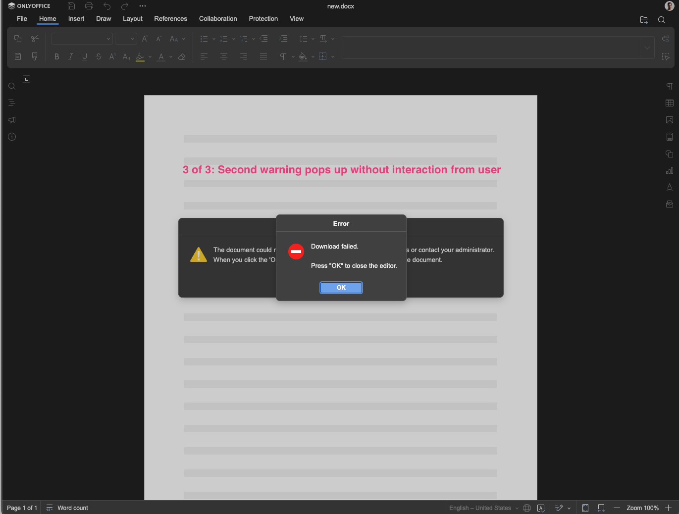 The document could not be saved. Please check connection settings or contact your administrator. When you click the “OK” button, you will be prompted to download the document.