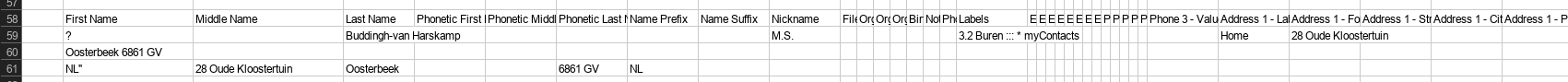 First Name,Middle Name,Last Name,Phonetic First Name,Phonetic Middle Name,Phonetic Last Name,Name Prefix,Name Suffix,Nickname,File As,Organization Name,Organization Title,Organization Department,Birthday,Notes,Photo,Labels,E-mail 1 - Label,E-mail 1 - Value,E-mail 2 - Label,E-mail 2 - Value,E-mail 3 - Label,E-mail 3 - Value,E-mail 4 - Label,E-mail 4 - Value,Phone 1 - Label,Phone 1 - Value,Phone 2 - Label,Phone 2 - Value,Phone 3 - Label,Phone 3 - Value,Address 1 - Label,Address 1 - Formatted,Address 1 - Street,Address 1 - City,Address 1 - PO Box,Address 1 - Region,Address 1 - Postal Code,Address 1 - Country,Address 1 - Extended Address,Address 2 - Label,Address 2 - Formatted,Address 2 - Street,Address 2 - City,Address 2 - PO Box,Address 2 - Region,Address 2 - Postal Code,Address 2 - Country,Address 2 - Extended Address,Relation 1 - Label,Relation 1 - Value,Website 1 - Label,Website 1 - Value,Website 2 - Label,Website 2 - Value,Event 1 - Label,Event 1 - Value,Event 2 - Label,Event 2 - Value,Custom Field 1 - Label,Custom Field 1 - Value