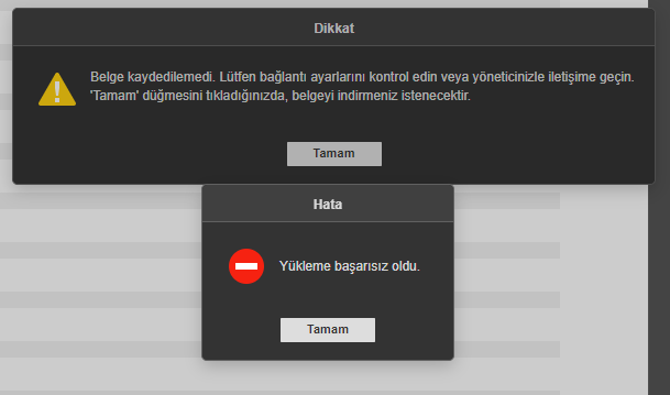 The document could not be saved. Please check the connection settings or contact your administrator. When you click the OK button, you will be prompted to download the document.