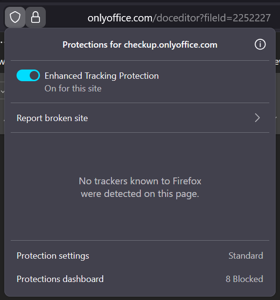 I also tried deactivating tracking protection. Unfortunately, Only Office still redirects me to the DocSapce page.