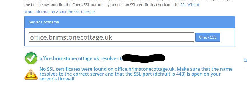 I can’t open office.brimstonecottage.uk in the browser and SSLshopper can’t find certificates: SSL Checker