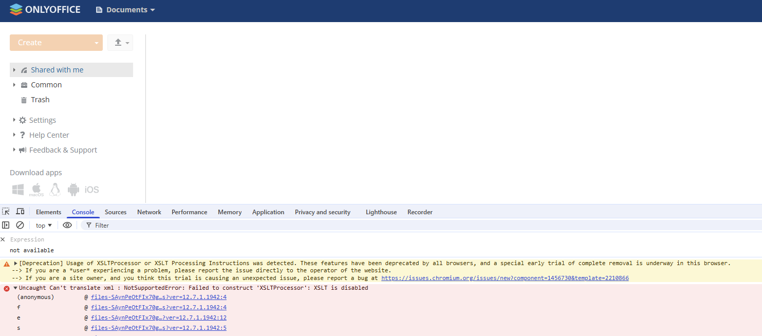 OnlyOffice Workspace relies on XSLT transformations to render the file manager UI. When XSLT support is removed or disabled in the browser engine, the interface cannot display files or folders.