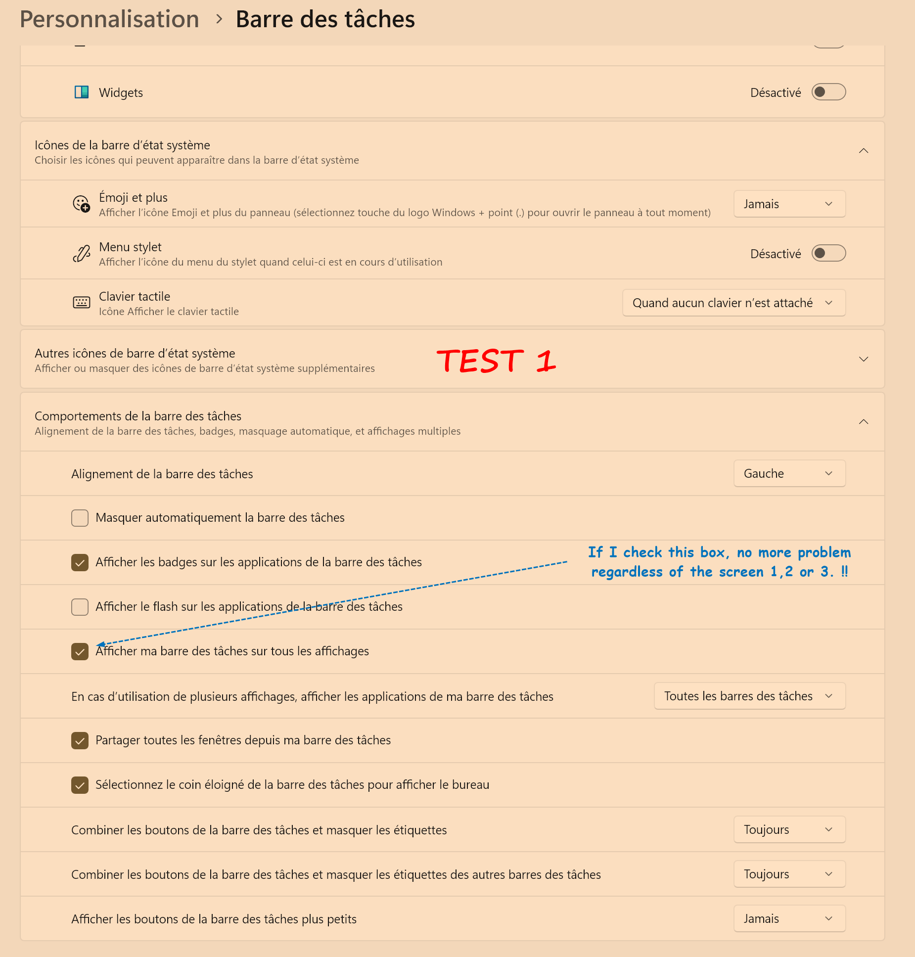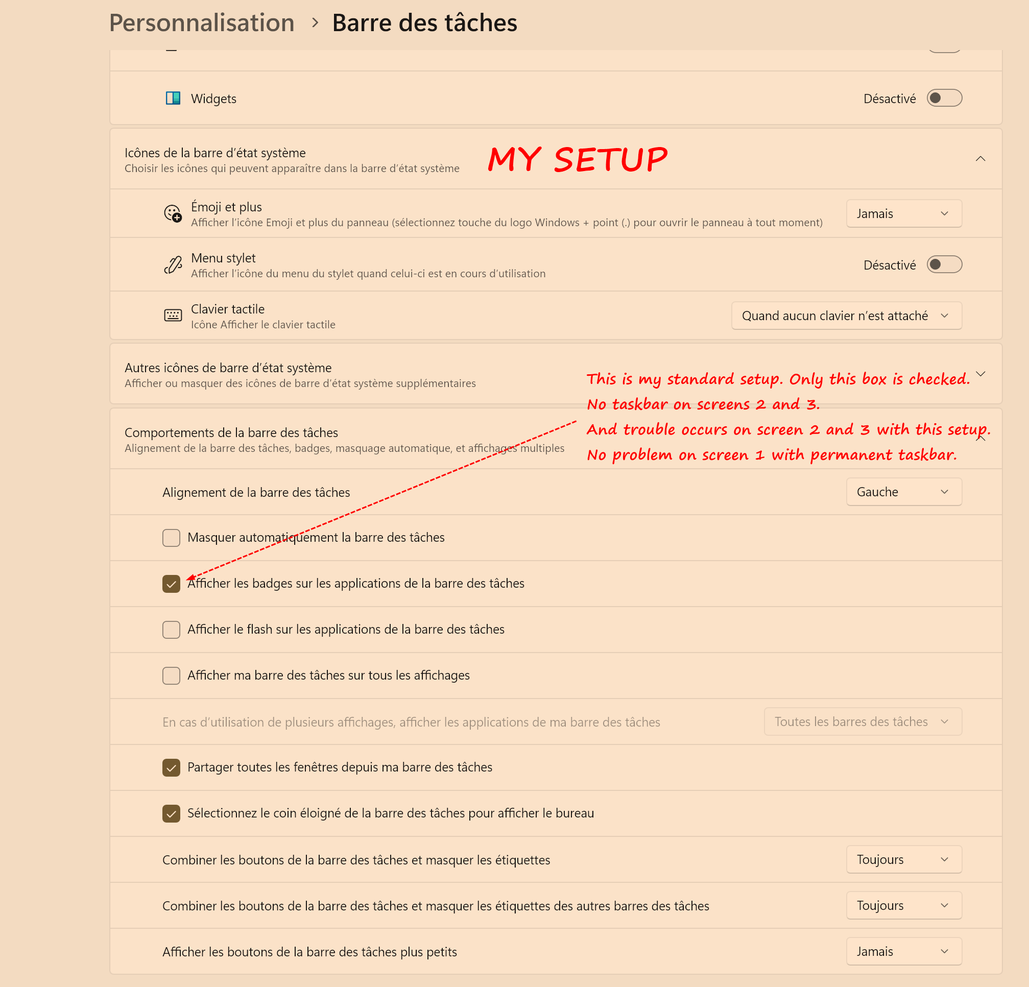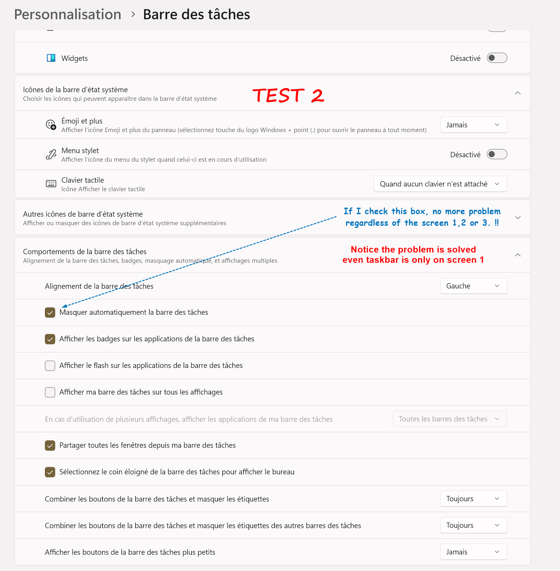 I want to keep my setup with the taskbar permanently visible only on screen 1. No taskbar on screens 2 & 3.