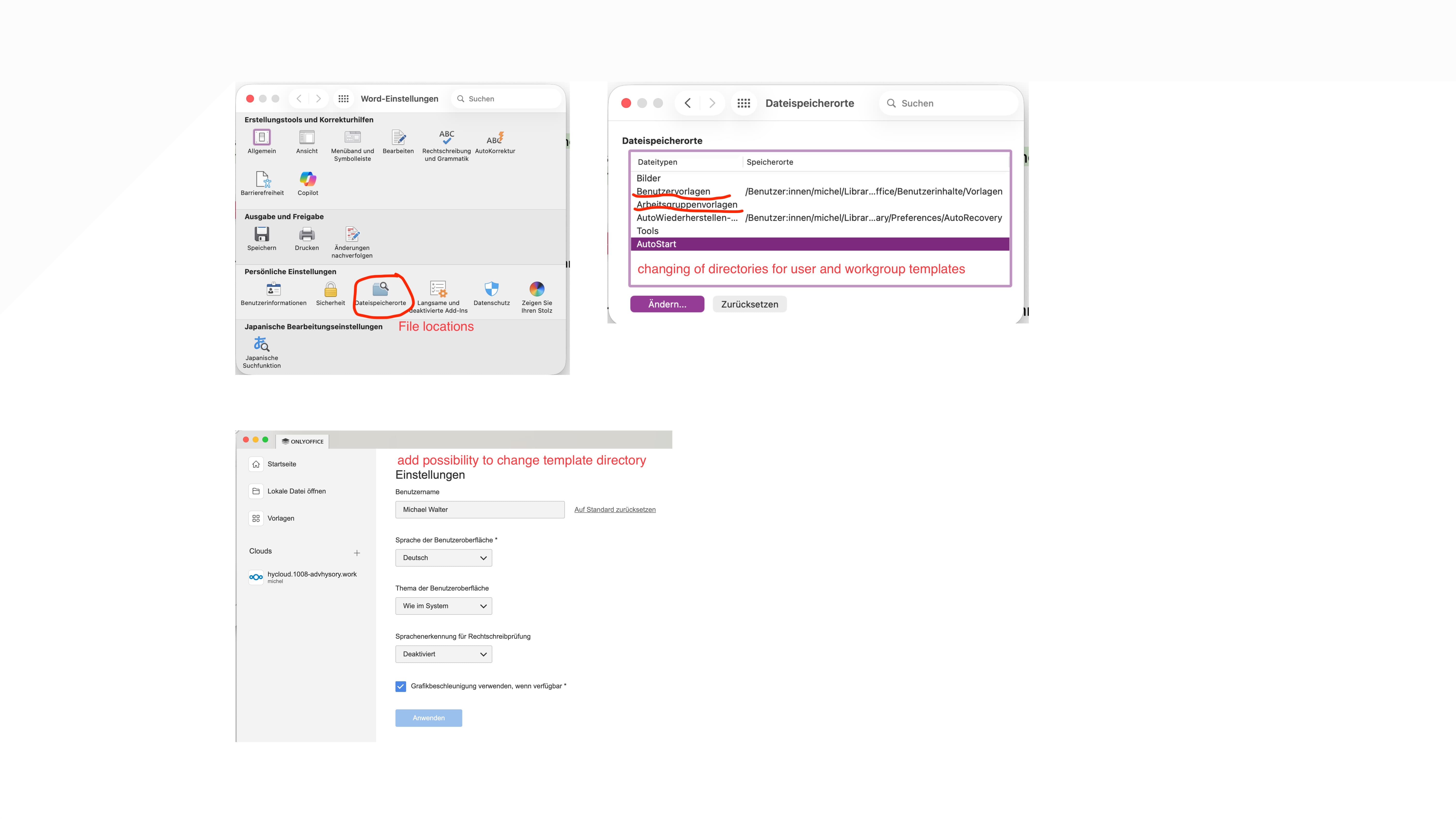 Well, I try to explain it with screenshots from MS Word and OnlyOffice. A separate directory to keep the own templates would improve the work experience with OnlyOffice.
