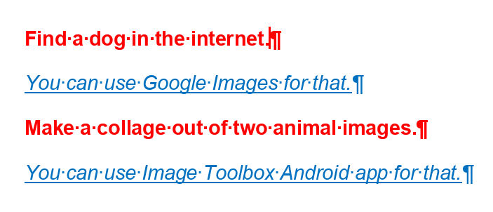 - There is a custom made red text style named RED, which must be followed by default by a style BLUE below