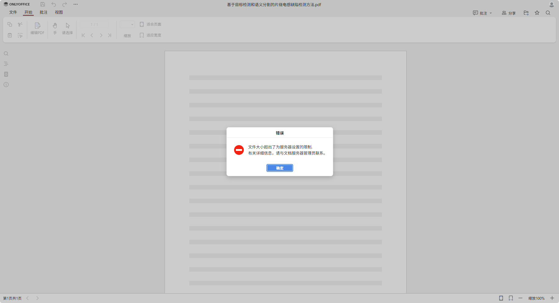 本地部署的onlyoffice Docspace打开PDF文件提示:大小超出了为服务器设置的限制!有关详细信息,请与文档服务器管理员联系。