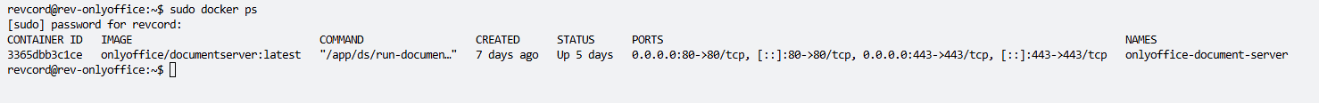 A screenshot of the output from the docker ps command on your server—this will help confirm the exact version and setup of ONLYOFFICE Docs Community Edition (v24.04, Docker).