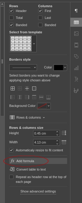 The Add formula option is not a separate icon in the vertical toolbar you showed. It appears as a button inside the table settings on the right sidebar and opens the Formula Settings window.